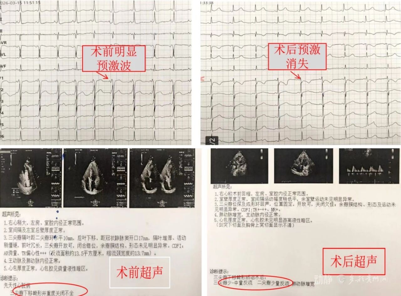 在确认心电活动恢复正常后,心外科团队接过“接力棒”,在同一个手术切口下,为患者精准实施了“Ebstein畸形”的解剖矫正术,修复了下移的三尖瓣,恢复了正常功能。