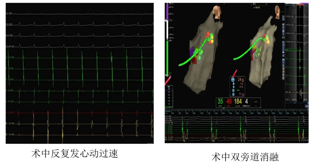 凭借三维标测系统与直视条件的双重优势,贵医附院心内科团队精准定位了包括位于憩室处高危旁道在内的右侧双旁道,并顺利实施了射频消融,成功阻断两条异常的“电路”。