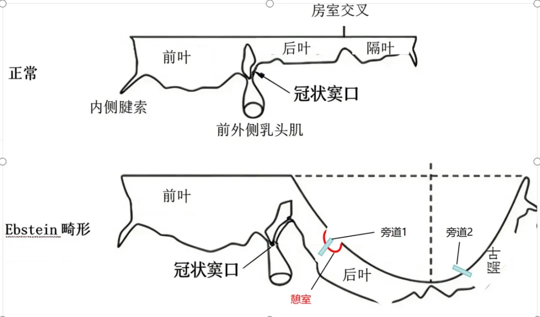图为患者Ebstein畸形模式图,三尖瓣隔瓣和后瓣下移,形成房化右室及特殊憩室样结构。患者高危旁道即位于憩室深处。术中在直视下精准标测并消融,是手术成功的关键。