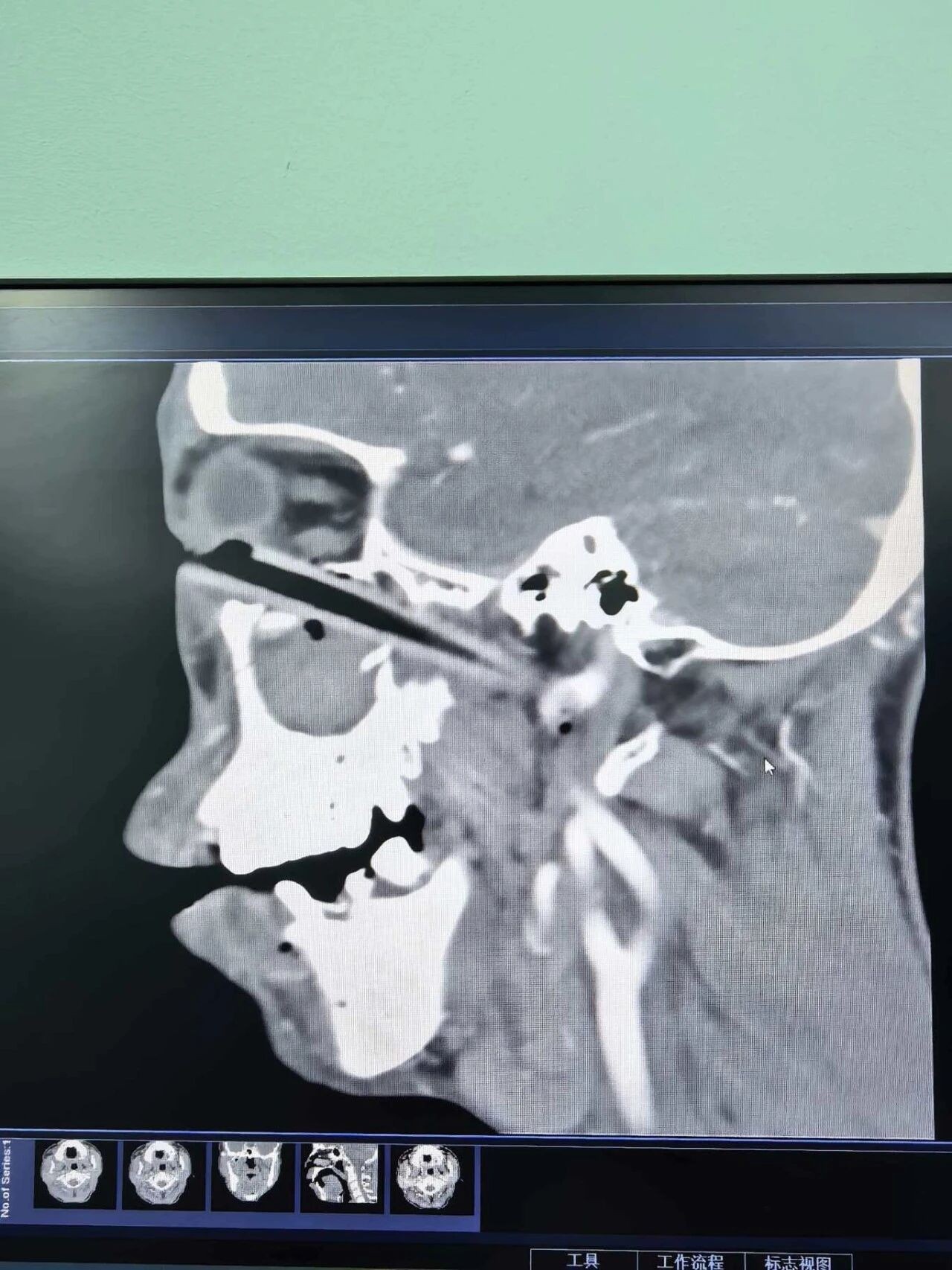 入院检查令人倒吸一口凉气:CT显示,一巨大异物从右眼内眦部刺入,不仅穿透眼眶底壁进入上颌窦,还接连“凿穿”上颌窦前后壁,闯入翼腭窝,进而穿透前颅底,轨迹直抵右侧颈部,尖端竟与颈总动脉管壁紧贴。
