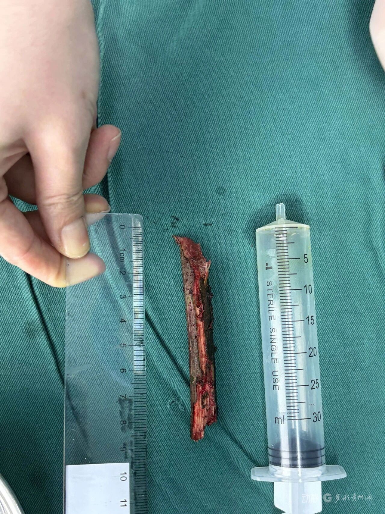 患者龙某近日在干农活时不慎摔倒致右眼被树枝刺入,导致右眼疼痛流血、睁眼困难。医生检查发现右眼眶内有巨大异物残留,其尖端与颈总动脉管壁相贴,十分危险。2月25日上午7:40,眼科联合颅脑外科、介入科、血管外科、口腔颌面外科召开全院MDT会诊讨论,制定手术方案。杨夏带领眼科医师对患者作眼眶开眶术后完整取出长达9cm的木质异物。目前,患者已完成后续治疗痊愈出院,右眼视力恢复到0.6。