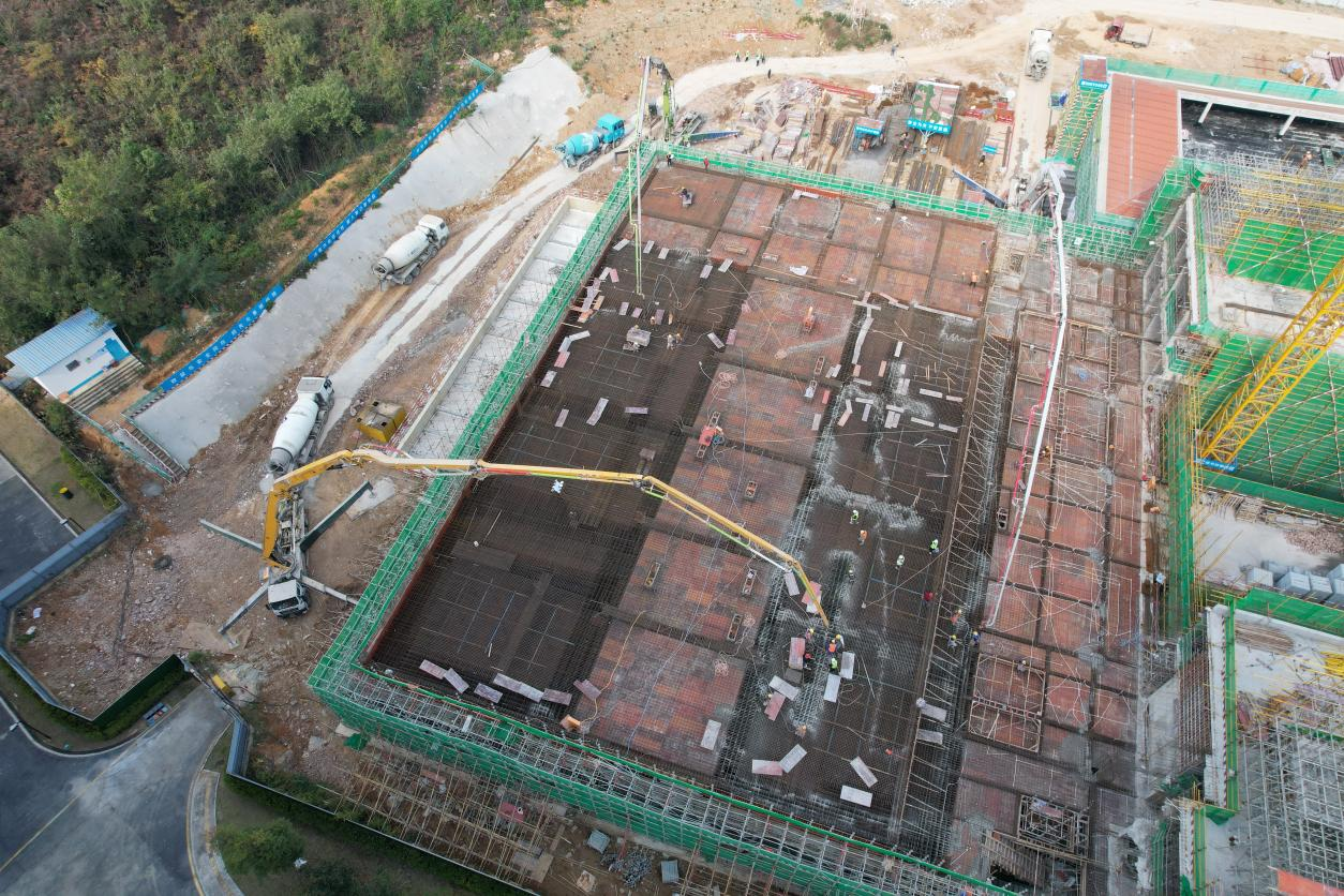 中山一院贵州医院(贵医附院贵安院区)二期建设项目主要建设肿瘤科及核医学科高端设备用房以及临床科研平台,新建分子肿瘤中心建筑面积13440平方米,改造肿瘤临床药物试验中心2250平方米;项目于2025年4月3日正式开工建设,各参建单位积极克服区域地下水丰富且地下水位高、溶洞发育率高、部分桩基深度超40m等不利条件下于2025年8月份顺利完成桩基施工;紧接着有序开展主体结构施工,施工单位在做好安全、质量保障的前提前“抢雨天、战晴天、斗夜间”,合理划分施工区域,于2025年10月25日完成分子肿瘤诊疗中心的主体结构的封顶;于2025年11月24日历时67小时一次性连续浇筑直线加速器区域大体积混凝土6800立方米,至此该项目主体结构顺利全面封顶;下一步将持续督促各参建单位在保证质量及安全的前提下加快室内砌体施工、安装施工、防辐射施工、装饰装修施工等,为医疗设备提供安装条件,高质量完成建设并投入使用;项目投入使用后以将肿瘤临床综合诊疗为基础,融合发展核医学科、放射治疗科、妇科等重点专科的医疗、护理、预防、康复;减少肿瘤患者跨省外就医,减轻患者的经济负担。