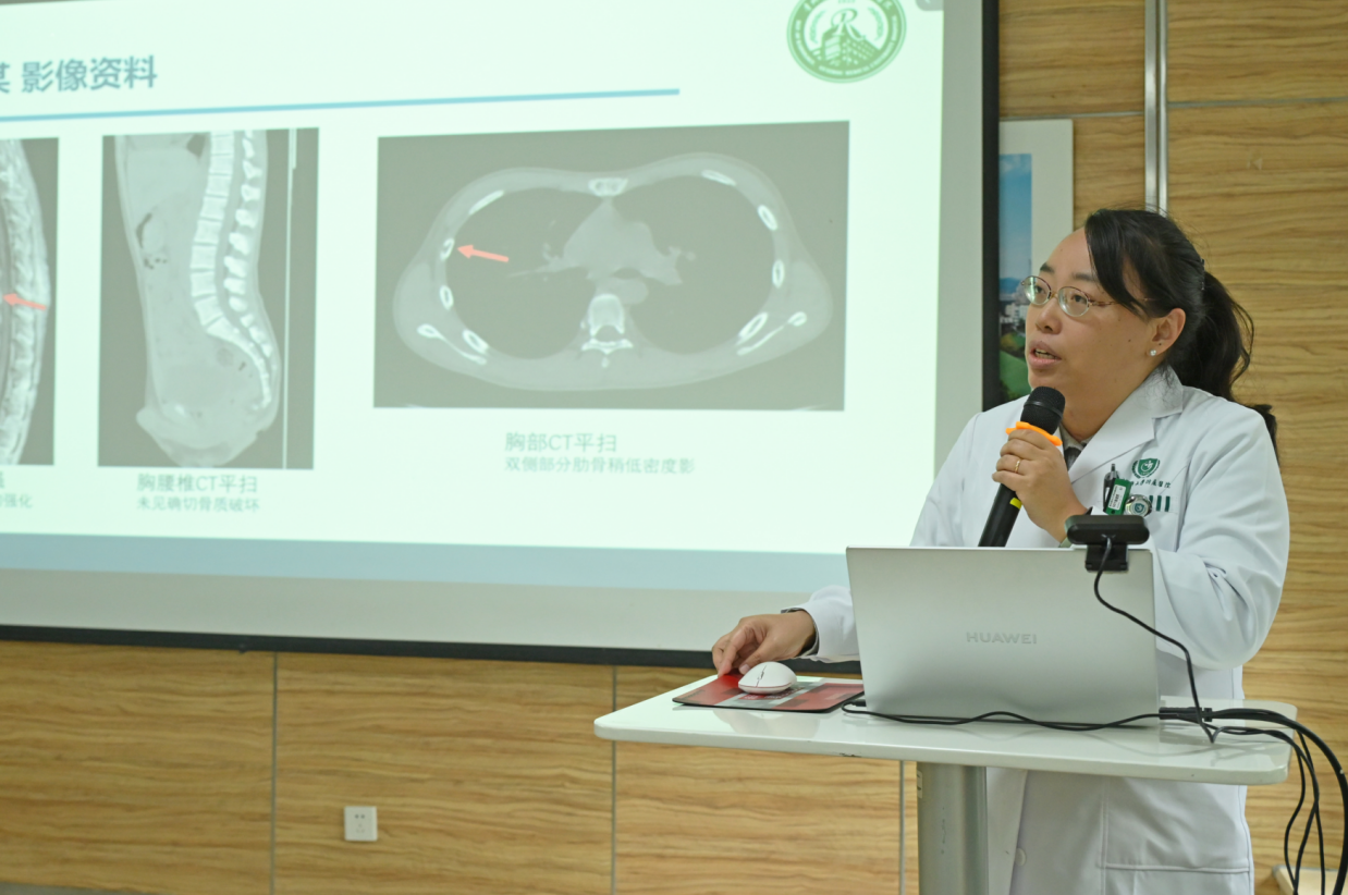 与会专家围绕患者病情,针对高钙血症的病因展开讨论。讨论中,影像科副主任陈佳妮针对这两例患者进行分析,两例患者的临床特点共同都是高钙,但是他的影像表现却是截然不同的。第一例患者影像显示骨质破坏是由于血液系统的疾病造成了骨细胞的破坏,从而出现高钙血症,而另一例患者影像显示骨质疏松,提示影像只看到冰山一角,对于病因确实需要结合临床、检验、病理检查等多方位来进行一个明确的诊断。