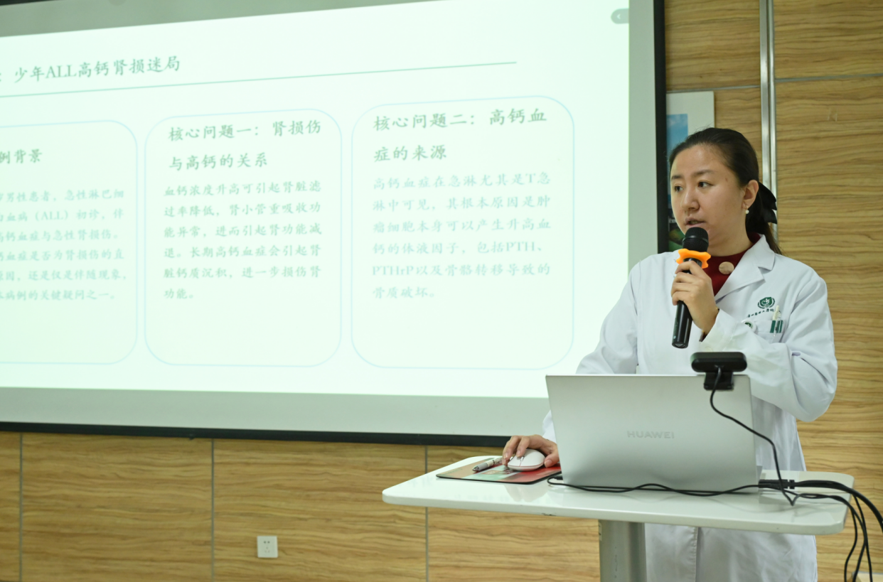 血液内科副主任陈莹医师从血液科专业的角度对第一个病例进行了分析,同时分享查阅的文献关于骨质破坏和急性淋巴细胞白血病的一个关系,目前有研究提示甲状旁腺相关蛋白水平升高与白血病细胞的增殖有关,进一步就可能会导致高钙,会引起肾脏的一个钙质的沉积,进一步损伤肾功能,但这种骨质破坏的患者预后相对更好。