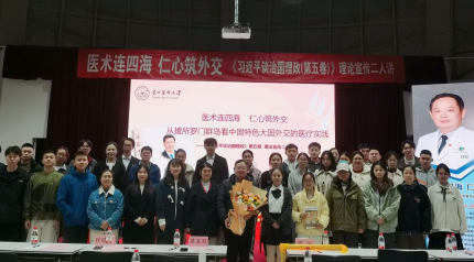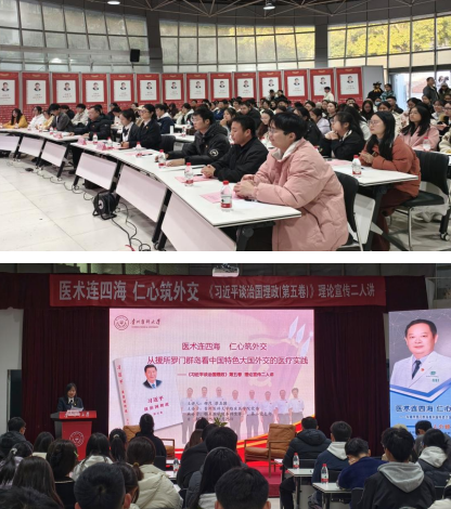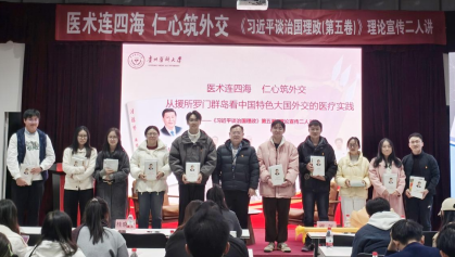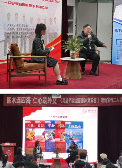 11月27日,临床医学院举办《习近平谈治国理政》第五卷“理论宣传二人讲”活动。本次活动以“医术连四海 仁心筑外交——从援所罗门群岛看中国特色大国外交的医疗实践”为主题,由临床医学院副院长、第三批援所罗门群岛中国医疗队队长穆茂与青年学生代表蔡真颖同学携手登台,采用“理论阐释+实践讲述”的对话模式,生动诠释援外医疗背后的理论力量与使命担当。临床医学院党委班子成员、临床医学院全体党支部书记、各年级辅导员、教工支部全体老师以及党员学生代表参与本次活动。活动由临床医学院党委副书记桂晓玲主持。