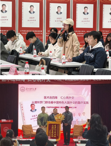 本次活动特设弹幕评论与提问环节,师生通过线上平台实时互动,畅抒感想、踊跃提问。现场举行了致敬援外医疗队员仪式,向参与互动的幸运同学赠送理论学习书籍,激励大家将理论融入日常、学思践悟。